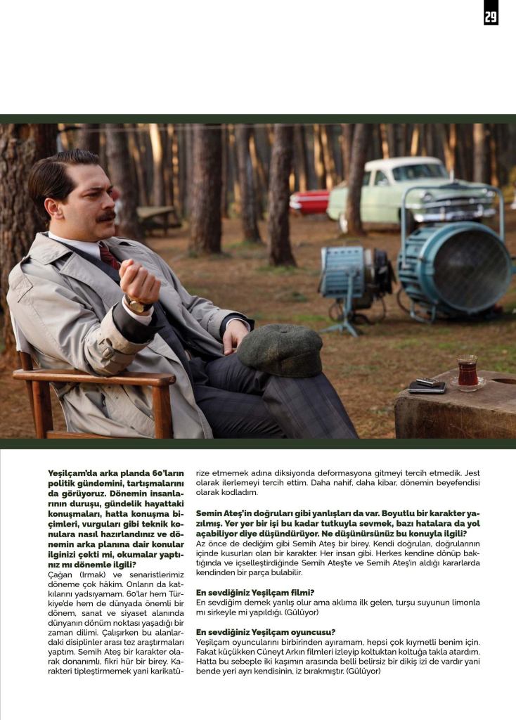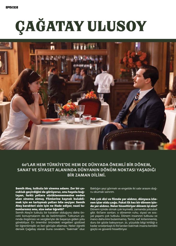 Çağan Irmak and our screenwriters are very familiar with the period. Their contribution was fundamental. The ’60s are an important era both in Turkey and around the world. During this time the world experienced political and artistic revolutions. While preparing for the role, I did some historical research. Semih Ateş is an intellectually free individual, with a strong personality. We chose not to give him a particular accent in order not to caricature the role. I preferred to focus on the physical representation. I identified him as naïve, kind and a gentleman-like.